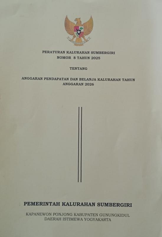 Pemerintah Kalurahan Sumbergiri Kapanewon Ponjong  bersama dengan Badan Permusyawaratan Kalurahan Sumbergiri telah menetapkan Peraturan Kalurahan Sumbergiri Nomor  8 Tahun 2025 tentang Anggaran Pendapatan dan Belanja Kalurahan Tahun 2026 pada tanggal 31 Desember 2025